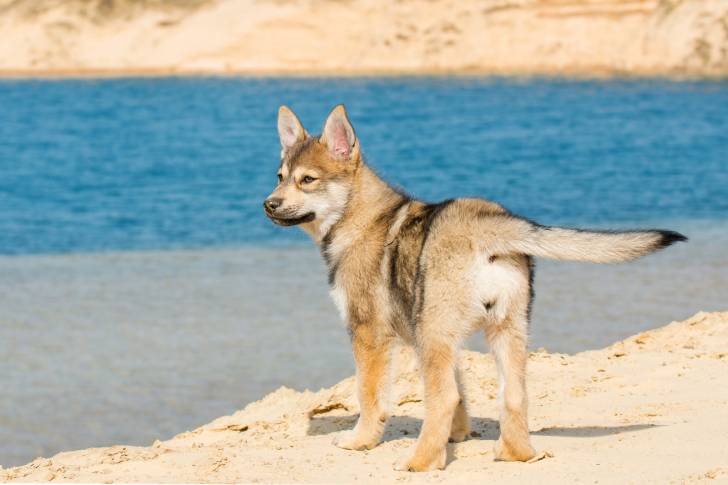 Séance d'éducation pour un chiot Tamaskan au cours d'une balade