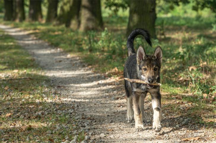 Séance d'éducation pour un chiot Tamaskan au cours d'une balade