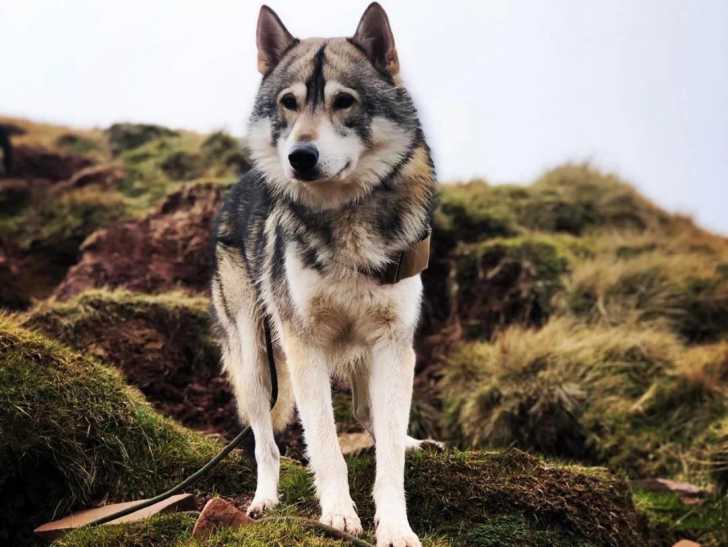 Séance d'éducation pour un chiot Tamaskan au cours d'une balade