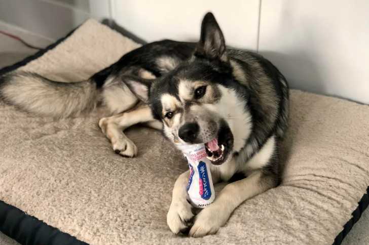 Un Tamaskan allongé dans un panier et mordant un bidon