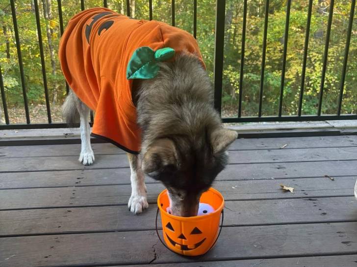 Un Tamaskan sur un plancher en bois et mangeant dans sa gamelle