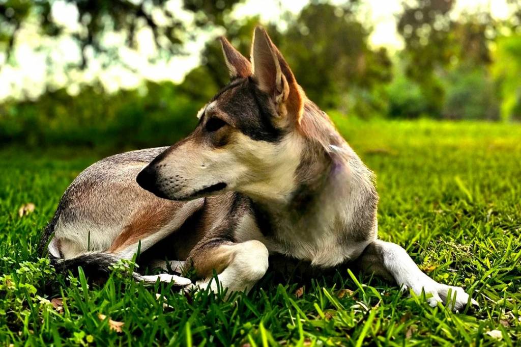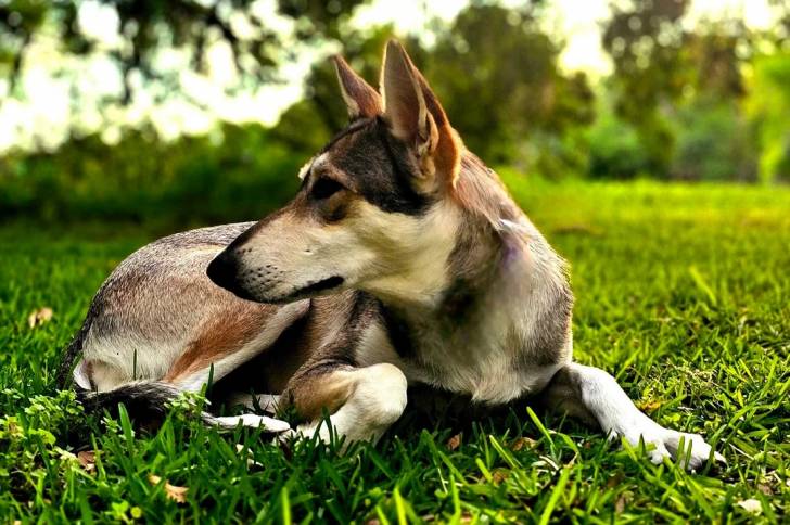 Un Tamaskan allongé sur une surface gazonnée