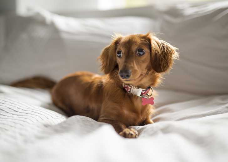 Un petit Teckel allongé sur un canapé