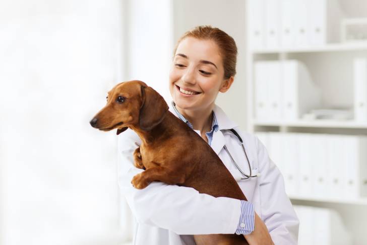 Un Teckel dans les bras d'un vétérinaire
