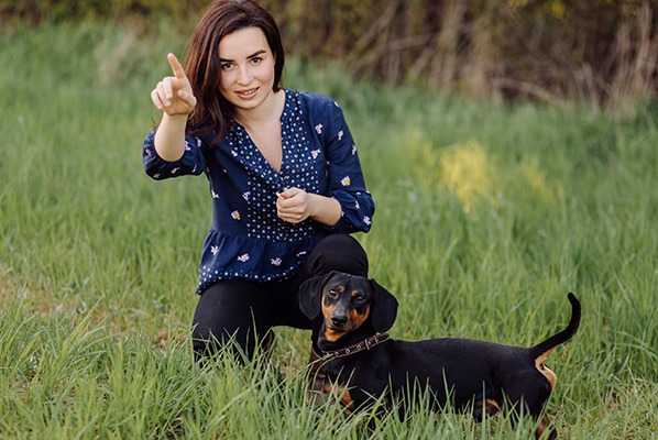 Un Teckel semblant suivre une séance d'éducation avec sa maîtresse