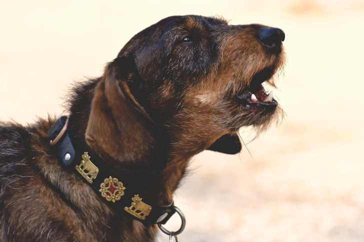 Un Teckel portant un collier autour du cou et semblant aboyer