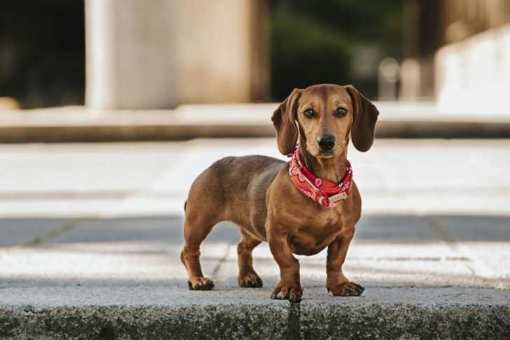 Un Teckel portant un foulard autour du cou et semblant monter la garde devant une maison