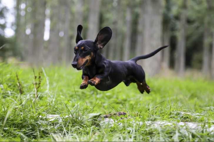Un Teckel en train de sauter en courant dans l'herbe
