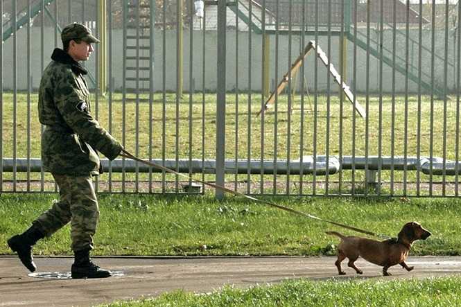 Un Teckel tenu en laisse par un millitaire