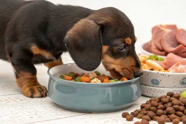Un chiot Teckel mangeant dans une des gamelles disposées devant lui