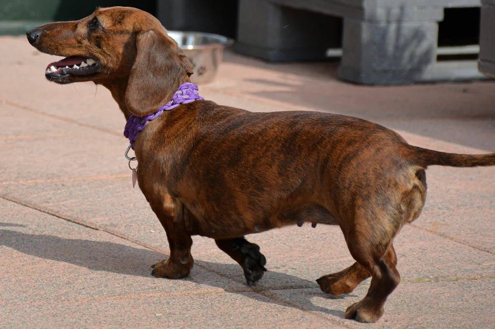 Un Teckel à la robe bringée et portant un collier autour du cou