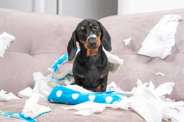 Un Teckel assis sur un canapé et ayant fait des dégâts