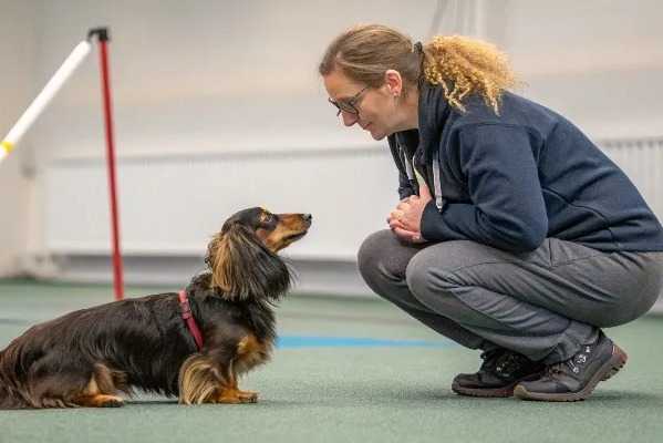 Un Teckel semblant écouter ce que lui dit sa propriétaire