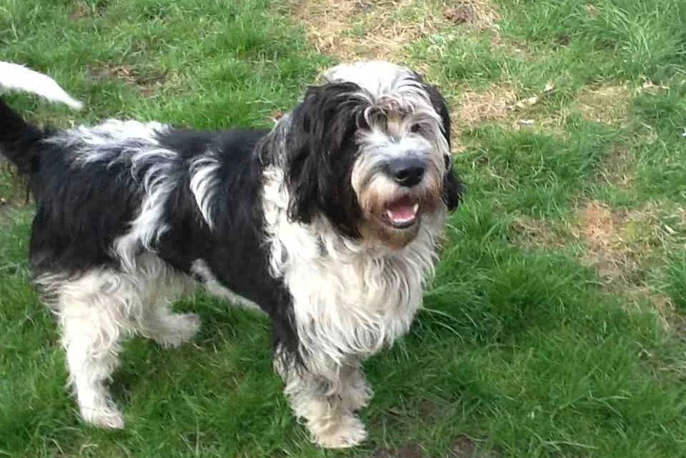 Un Tibecot sur une surface herbacée et ayant la gueule ouverte