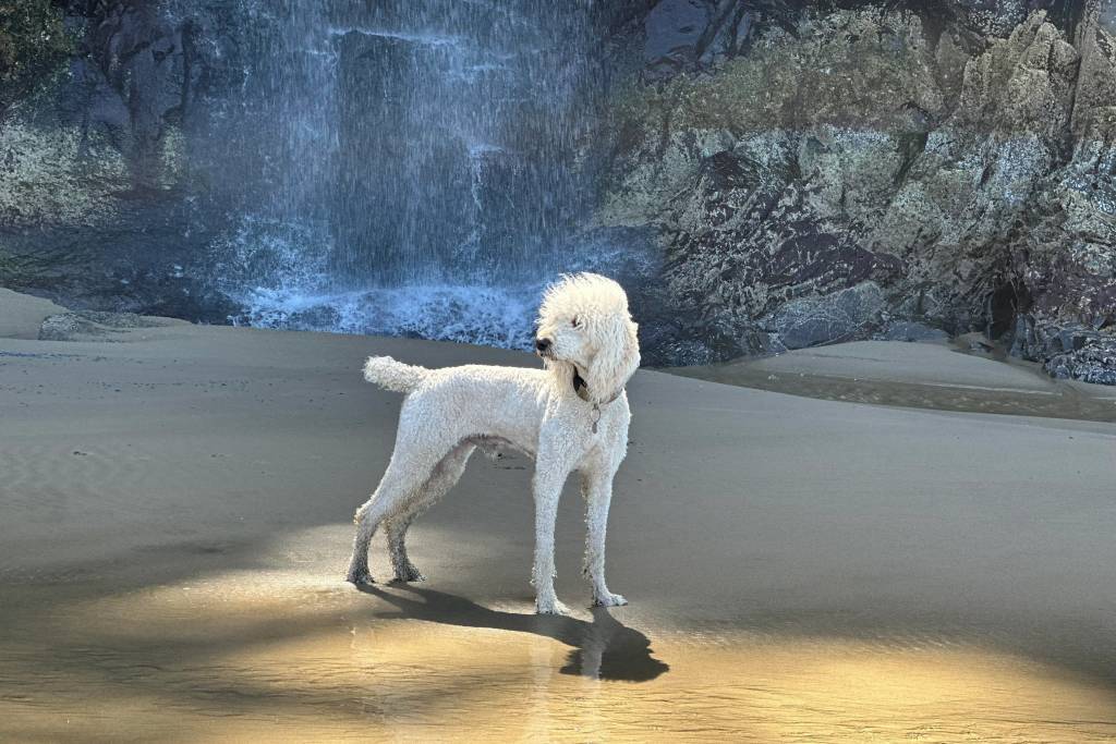 Un Ttoodle sur une surface sableuse et portant un collier autour du cou