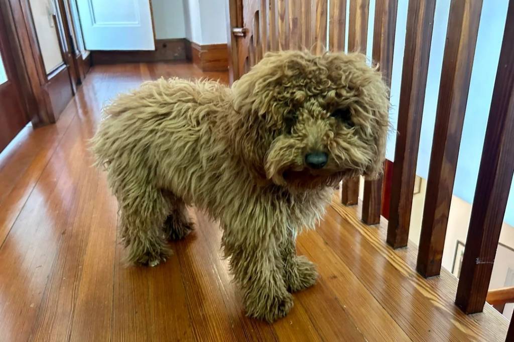 Un Ttoodle sur un plancher et regardant vers la caméra