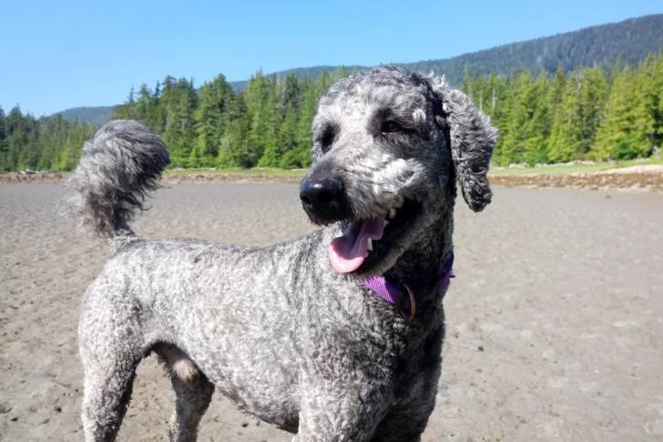 Un Ttoodle sur une surface sableuse ayant la gueule ouverte et portant un collier autour du cou