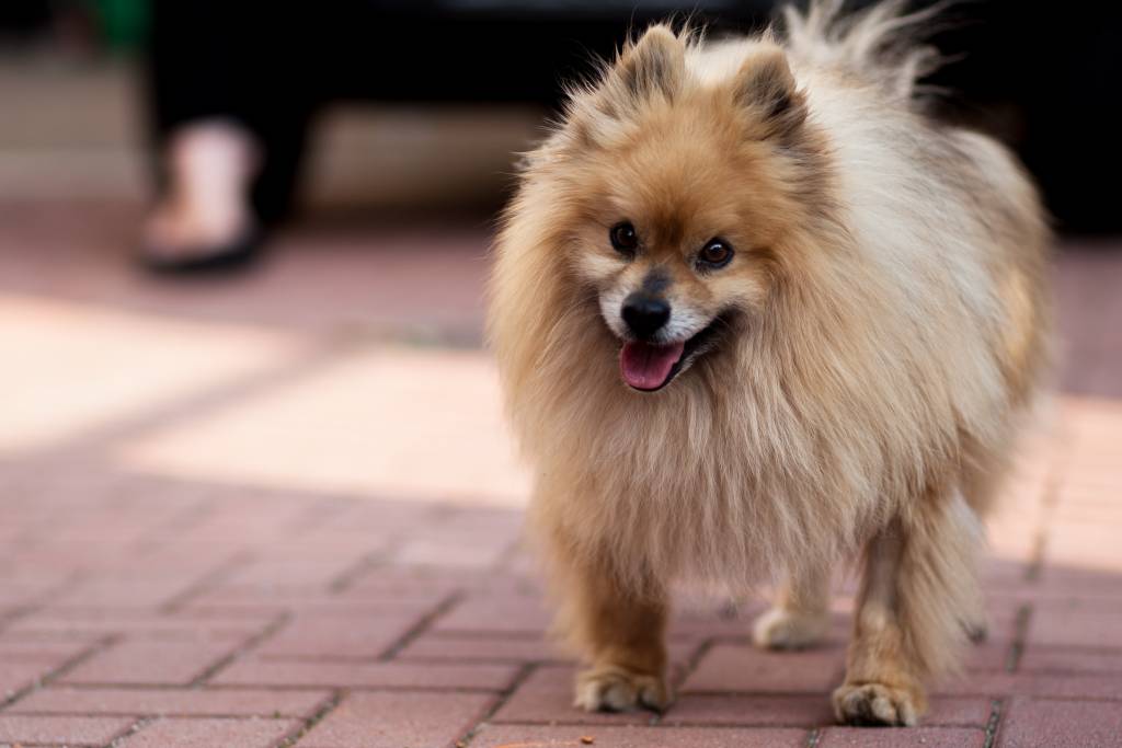 Un Volpino essaie d'attraper une saucisse posée sur la table