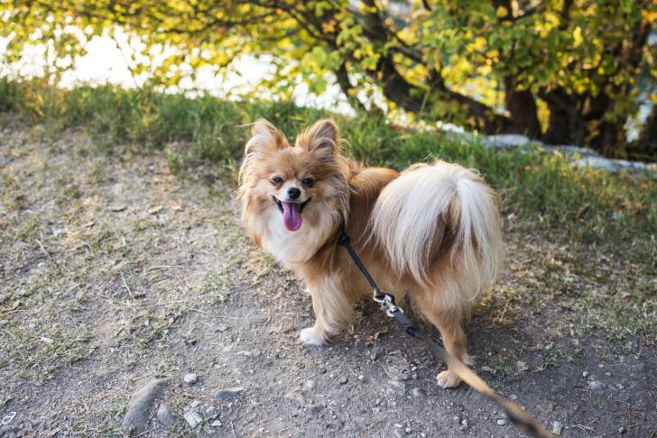 Un Volpino essaie d'attraper une saucisse posée sur la table
