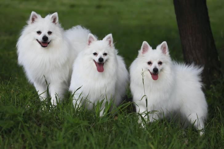 Un Volpino essaie d'attraper une saucisse posée sur la table