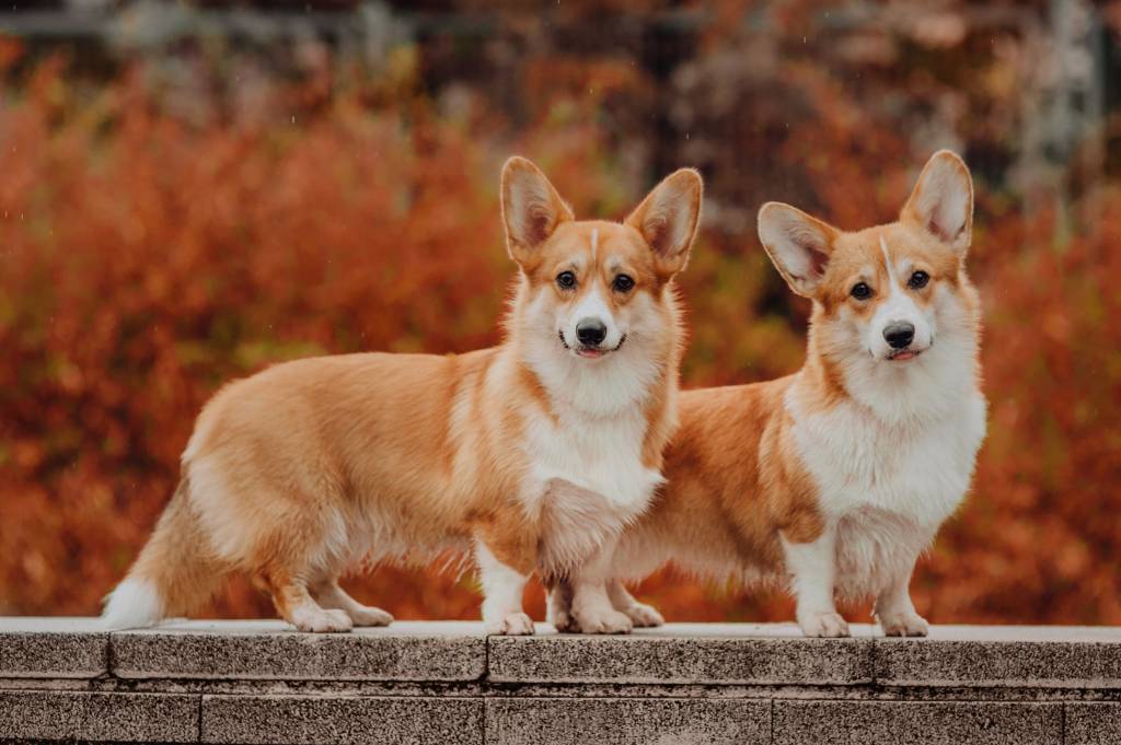 Deux Welsh Corgi Cardigan marchent sur un muret