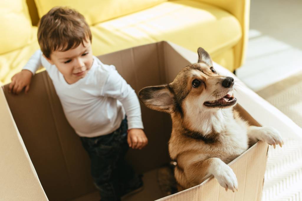 Un Welsh Corgi Pembroke jouant avec un petit garçon dans une boîte en carton