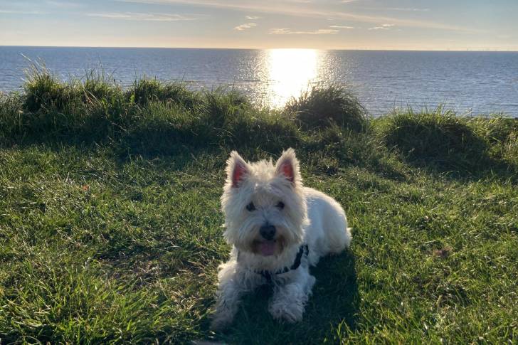 Un West Highland Doxie allongé sur un terrain herbeux et regardant vers la caméra