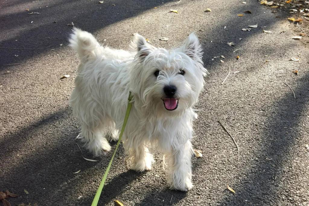 Un West Highland Doxie sur une voie goudronné ayant la gueule ouverte et tenu en laisse