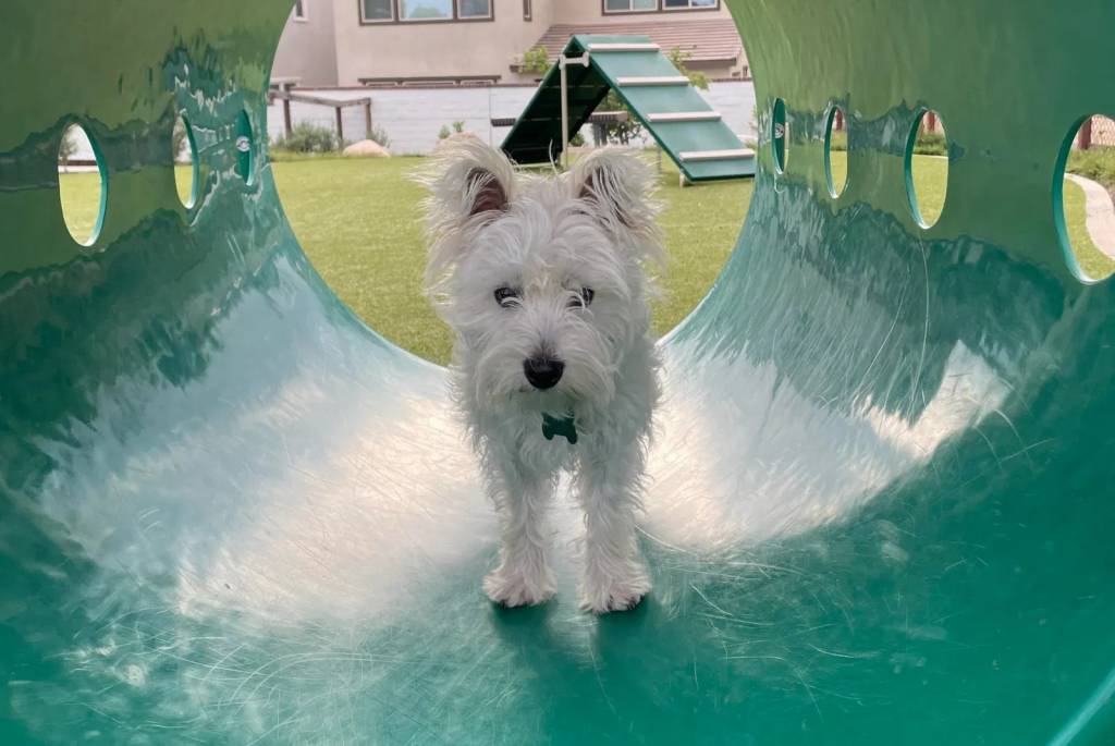 Un West Highland Doxie portant un collier autour du cou et regardant vers la caméra