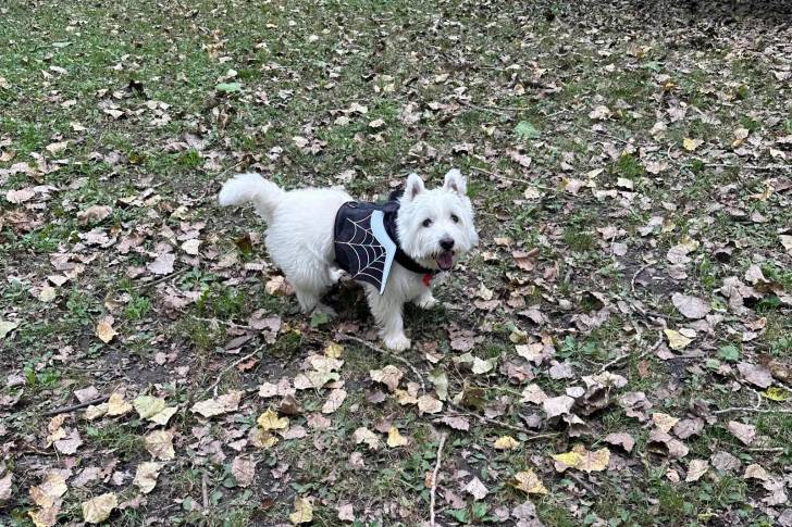 Un West Highland Doxie marchant sur une surface pleine de feuilles mortes