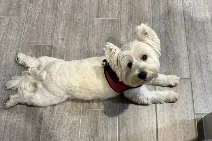 Un West Highland Doxie allongé sur un parquet et portant un harnais