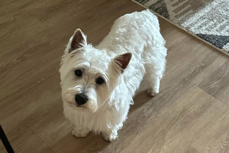 Un West Highland Doxie sur un parquet et regardant vers la caméra