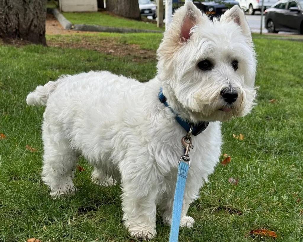 Un West Highland Doxie sur un terrain herbeux et qui est tenu en laisse