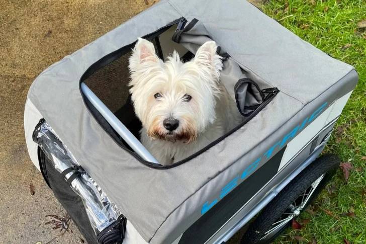 Un West Highland Doxie assis dans un sac et regardant la caméra