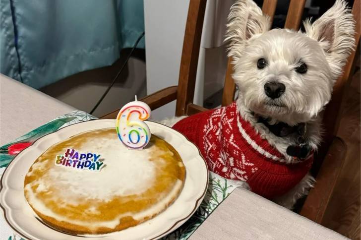 Un West Highland Doxie assis sur une chaise portant un manteau pour chien et semblant vouloir manger