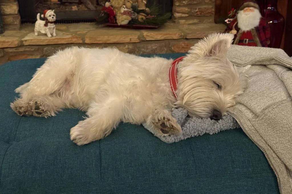 Un West Highland Doxie dormant sur un canapé et portant un collier autour du cou
