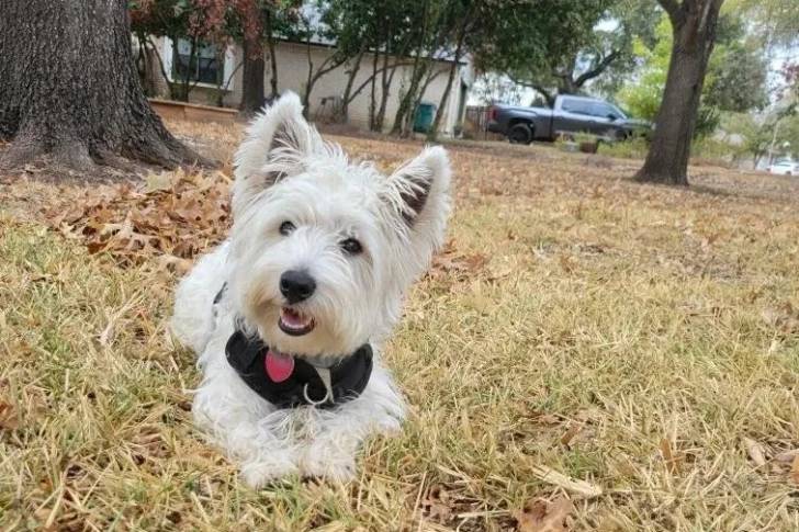 Un West Highland Doxie allongé sur un surface herbeuse et portant un harnais