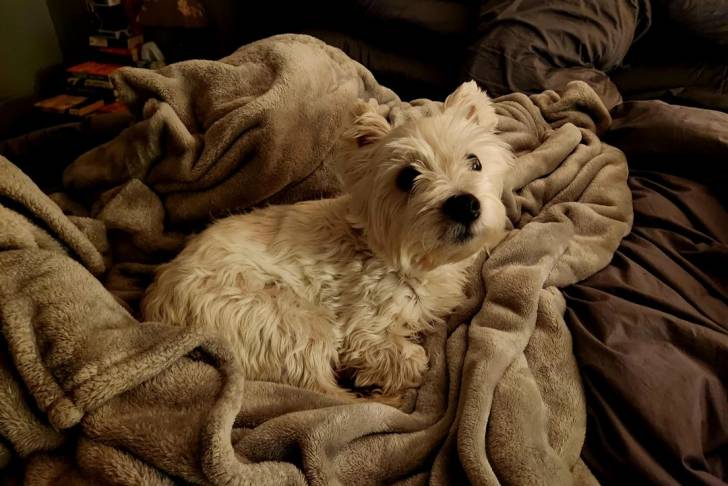 Un West Highland Doxie allongé sur une couverture et regardant vers la caméra