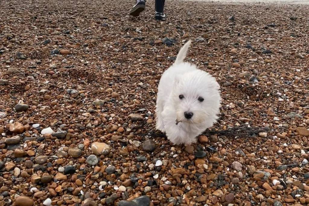 Un West Highland Doxie marchant sur des gravillons et regardant vers la caméra