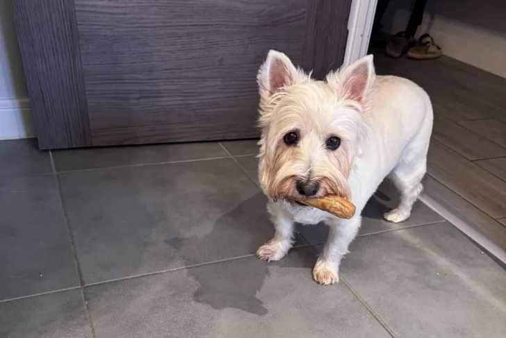 Un West Highland Doxie sur un sol carrelé et ayant un morceau de saucisse dans sa gueule