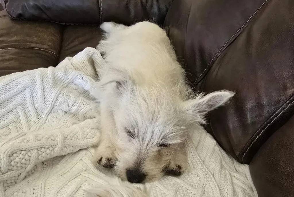 Un West Highland Doxie allongé dans un canapé et semblant dormir