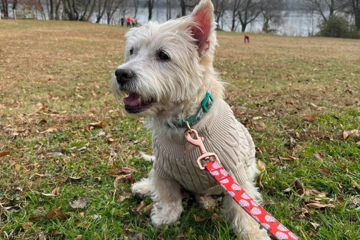 Un West Highland Doxie assis sur un terrain herbeux portant un manteau et qui est tenu en laisse