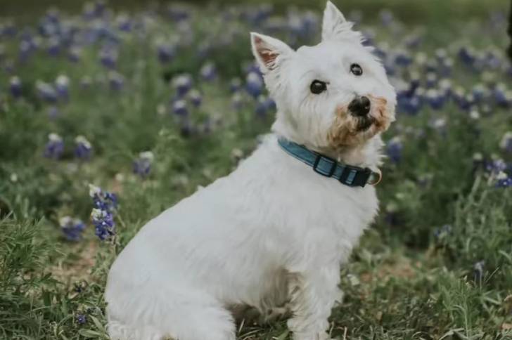 Un West Highland Doxie assis sur un terrain herbeux et portant un collier au cou