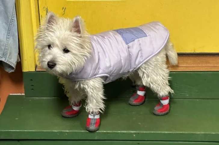 Un West Highland Doxie sur l'une des marche d'un escalier et portant un manteau