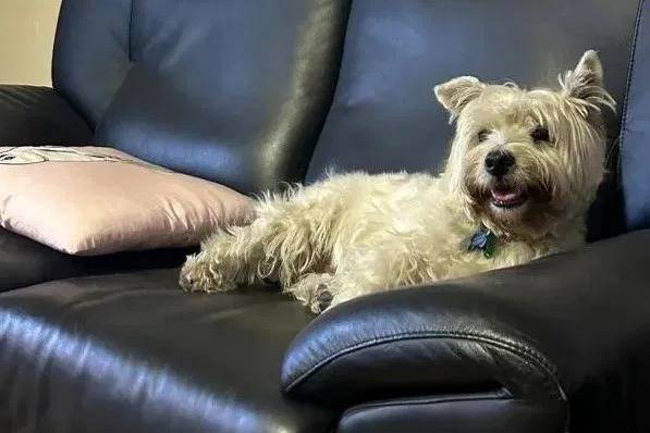 Un West Highland Doxie allongé sur un canapé et portant un collier au cou