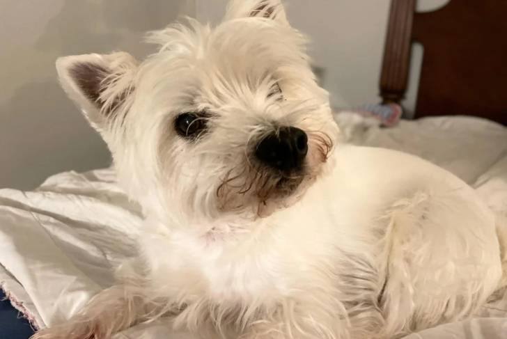 Un West Highland Doxie allongé sur un lit et regardant la caméra