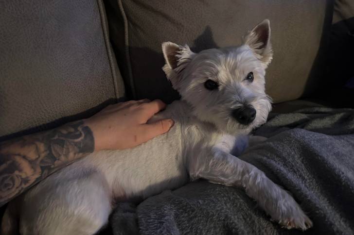 Un West Highland Doxie allongé sur un canapé et se faisant caresser les poils