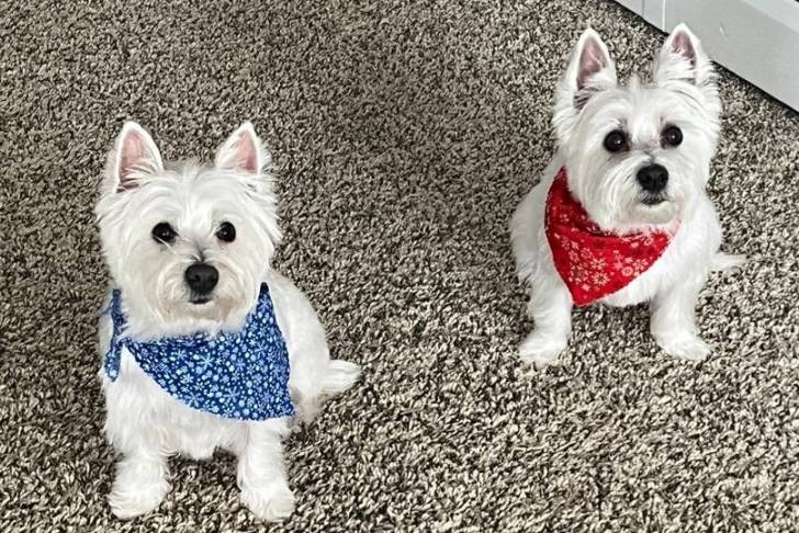 Deux West Highland Doxie assis sur une moquette portant chacun un foulard et regardant vers la caméra