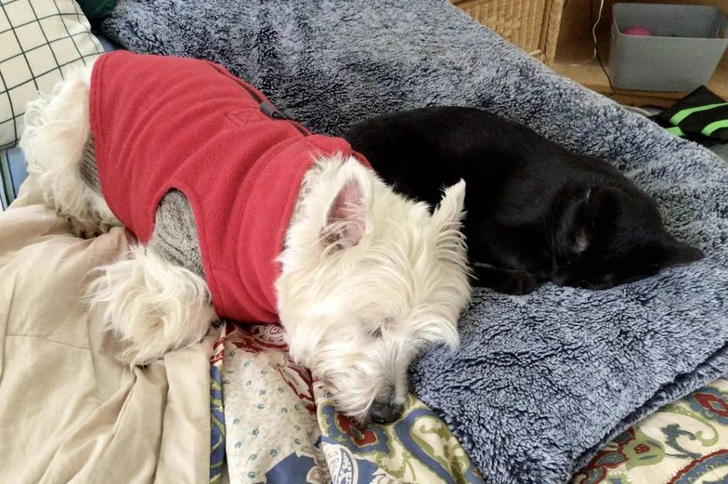 Un West Highland Doxie portant un pull-over allongé à côté d'un chat et semblant dormir