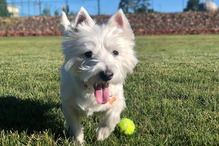 Un West Highland Doxie marchant sur un terrain herbeux et tirant la langue